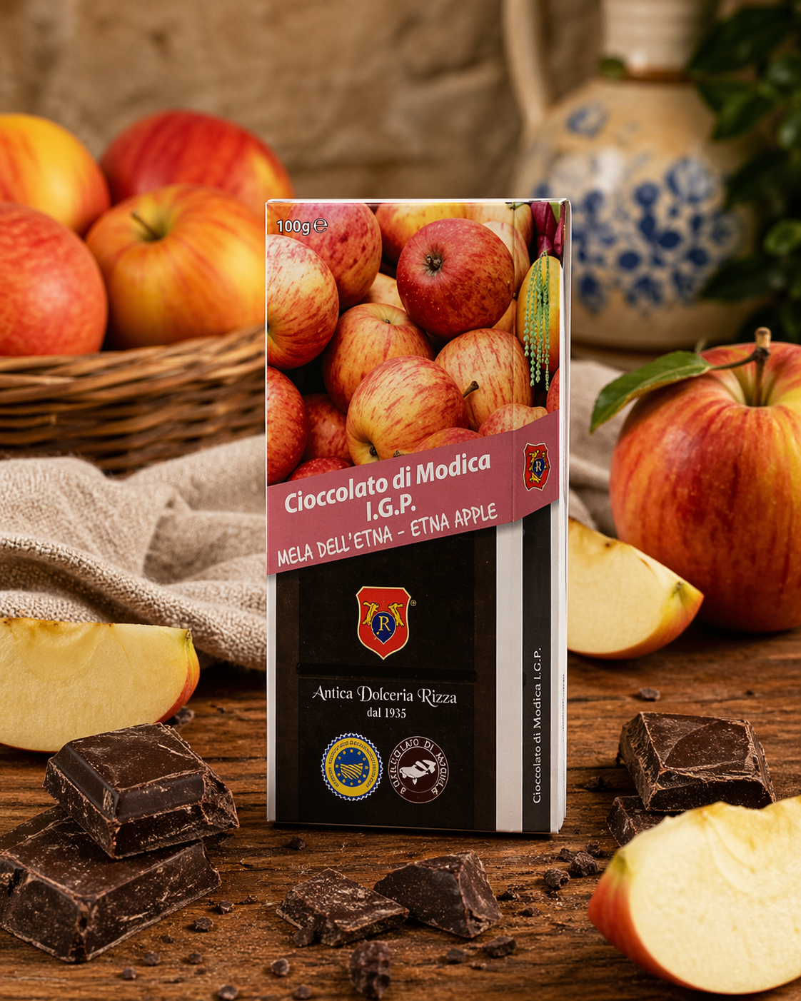 Il Cioccolato di Modica IGP alla Mela dell’Etna unisce il gusto intenso del cacao lavorato a freddo con la dolcezza fruttata e leggermente acidula delle mele coltivate alle pendici dell’Etna, simbolo di purezza e tradizione.