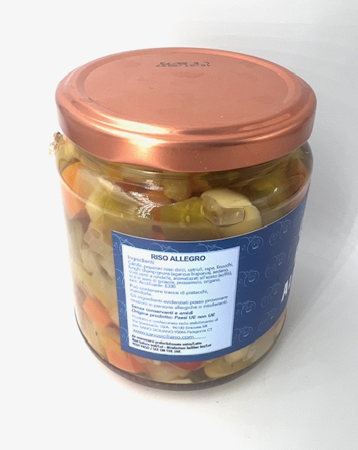 Dolci peperoni rossi e il verde sfumato del sedano, il violetto delle rape e l’arancione acceso delle carote, il bianco giallo dei finocchi e il verde intenso dei cetrioli, olive verdi e funghi champignon, lavorati e tagliati appena raccolti. E’ un ottimo condimento per insalate di riso aromatizzato all’aceto di vino e con spezie selezionate, abbiamo messo il meglio del nostro orto, dei nostri colori, della nostra idea di sapore e croccantezza. Per trasformando anche una “semplice”, ma sempre apprezzata, insalata di pasta fredda, di riso o di farro.