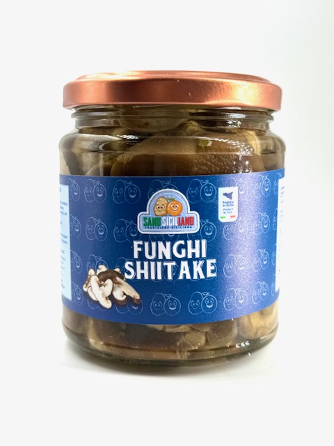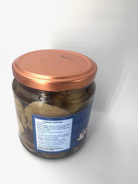 Funghi Shiitake 55% (lentinus edoses), aromatizzati all’aceto (solfiti), olio di semi di girasole, origano, aglio, prezzemolo, sale, peperoncino, Acidificante: E330.