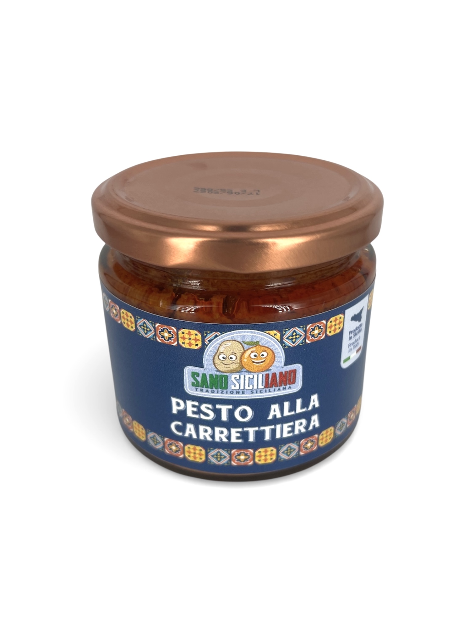 Un condimento autentico della tradizione siciliana, dal carattere deciso e genuino. Il Pesto alla Carrettiera nasce dall’incontro di ingredienti semplici ma intensi: aglio profumato, prezzemolo fresco, olio extravergine d’oliva, pomodori secchi, e un tocco di peperoncino. esalta il gusto puro delle materie prime e sprigiona un profumo inconfondibile.