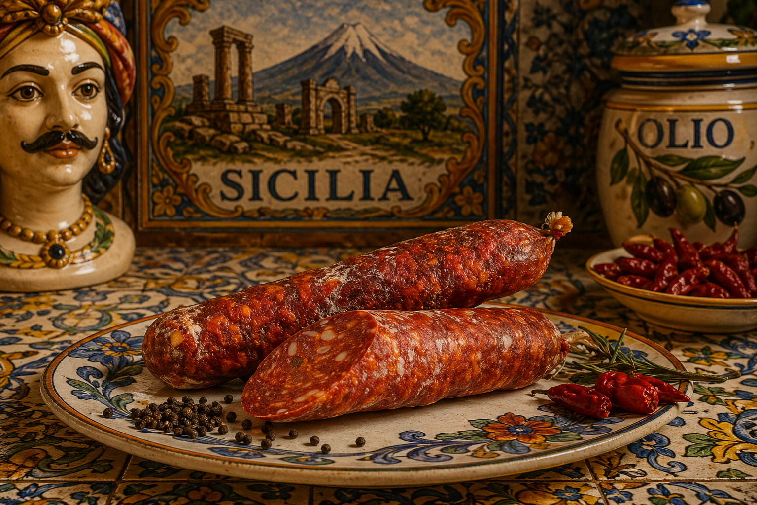 Preparato con carni di suino selezionati e condito con aromi 100% naturali e peperoncino che gli conferiscono un sapore decisamente e piacevolmente piccante. Il nostro salame siciliano piccante e ottimo per la preparazioni di antipasti o aperitivi accompagnato da formaggi tipici siciliani e un ottimo calice di vino rosso. in Sicilia si usa tanto anche per condire pizze e focacce.